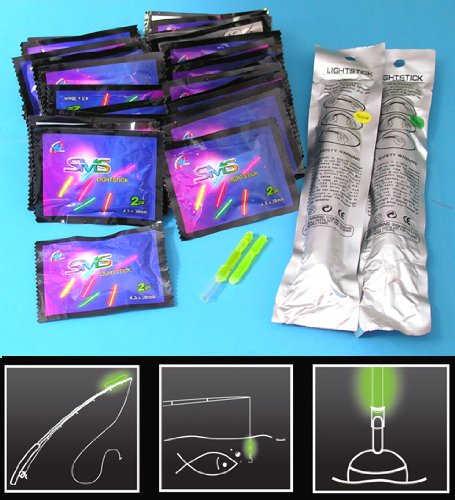 The sale is for 50pcs of mini glow sticks with Green illumination Packed in 2pcs per pack. Size of these mini glow sticks is 4.5mm DIA X 38mm (1 1/2") LONG. Similar lights typically cost $1.99each in shops. These are great for night fishing use. The long lasting glow light stick emits 360 degree of illumination and is visible from all directions. To activate the lights, simply bend, snap the glow stick and shake. The light sticks last approximately 8hours. The light sticks are non-toxic and will not pollute water or harm fish.Also included is a bonus of TWO 6inch glow sticks. These can also be used for night fishing as fishing floats. These 6inch light sticks last approximately 8hours.The light sticks are non-toxic and will not pollute water or harm fish.